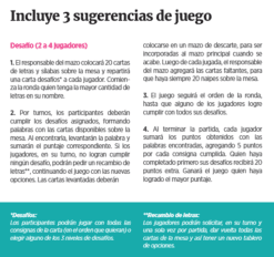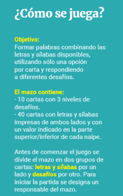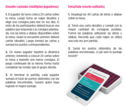 En Desafío Vocablos vamos a jugar armando palabras con cartas de letras o sílabas, respondiendo a distintas cartas de desafíos que posen 3 niveles dificultad y múltiples desafíos según el nivel. Posee 3 sugerencias de juego.