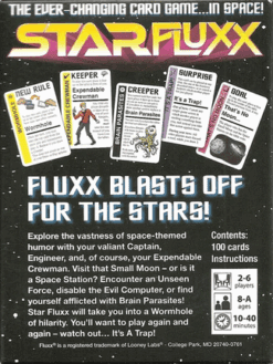 En Star Fluxx, la versión con temática espacial del muy conocido juego Fluxx, vamos a tener que bajar cartas en el medio del caos que es este juego para lograr cumplir alguno de los cambiantes objetivos, siempre, siguiendo la regla básica de levanta una, juega una, hasta que a alguien se le ocurra empezar a bajar nuevas reglas y la partida de hunda en un verdadero caos.