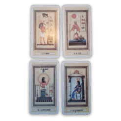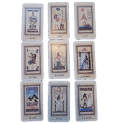 El Tarot Egipcio es una variante especializada del tradicional juego de cartas del Tarot, destacada por su exactitud y su profundidad en el plano esotérico. Esta baraja se considera sagrada y se le atribuye el poder de contener las claves de los dogmas y fuerzas ocultas. Su estudio requiere el entendimiento de colores, símbolos y características particulares. Las cartas están ilustradas con escenas inspiradas en el antiguo Egipto, fácilmente identificables por quienes tienen nociones básicas de esta cultura. En la parte superior de cada carta aparece una deidad egipcia, relacionada con lo espiritual y lo mental, mientras que en la parte inferior se representa un símbolo que enriquece su significado. Cada arcano brinda una doble lectura: una interpretación espiritual y otra orientada a la adivinación, ambas complementadas con referencias a la mitología egipcia, codificadas a través de signos y símbolos esotéricos. También incorporan la letra hebrea correspondiente según la sabiduría de la Cábala, junto con datos relevantes de astrología. El set incluye un manual que guía al usuario en el uso e interpretación de cada una de las cartas.